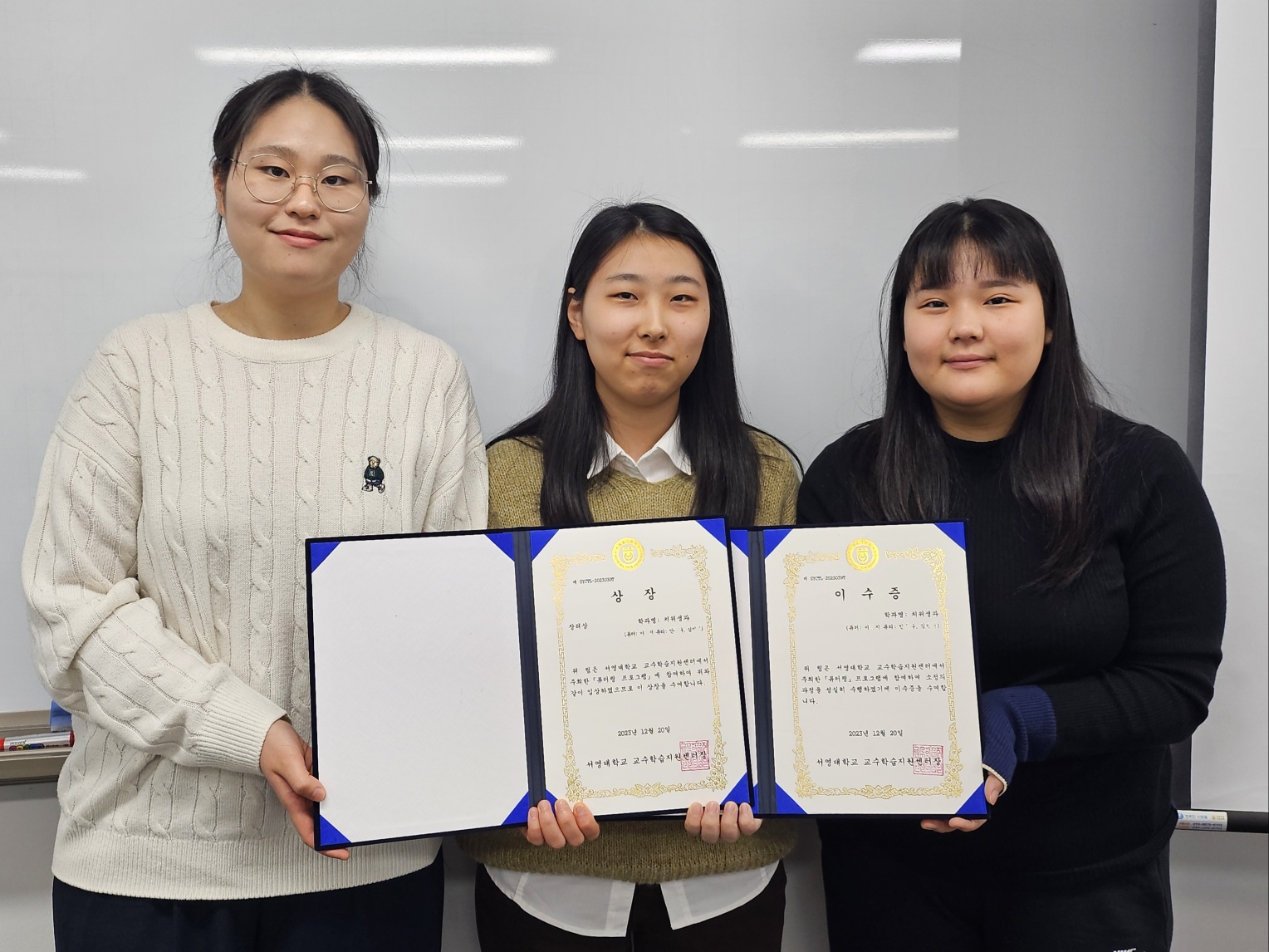 2023 튜터링 프로그램에 참여하여 우수상을 수여받은 이*지, 안*나, 김*선 학생입니다 ^^!