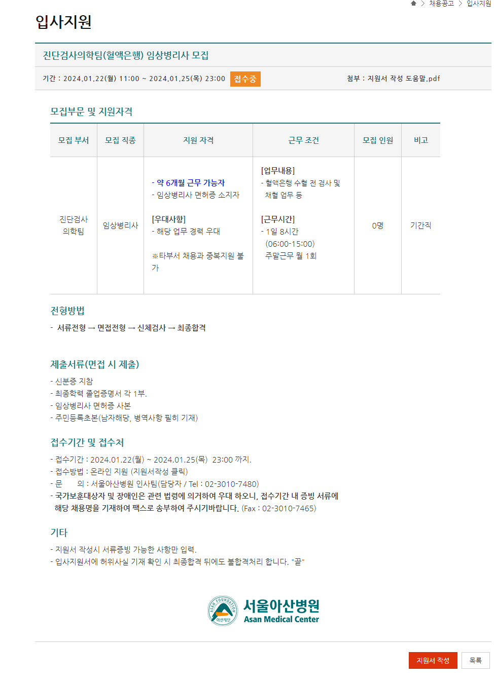 입사 지원: 입사지원 | 채용공고 | 서울아산병원 (amc.seoul.kr)