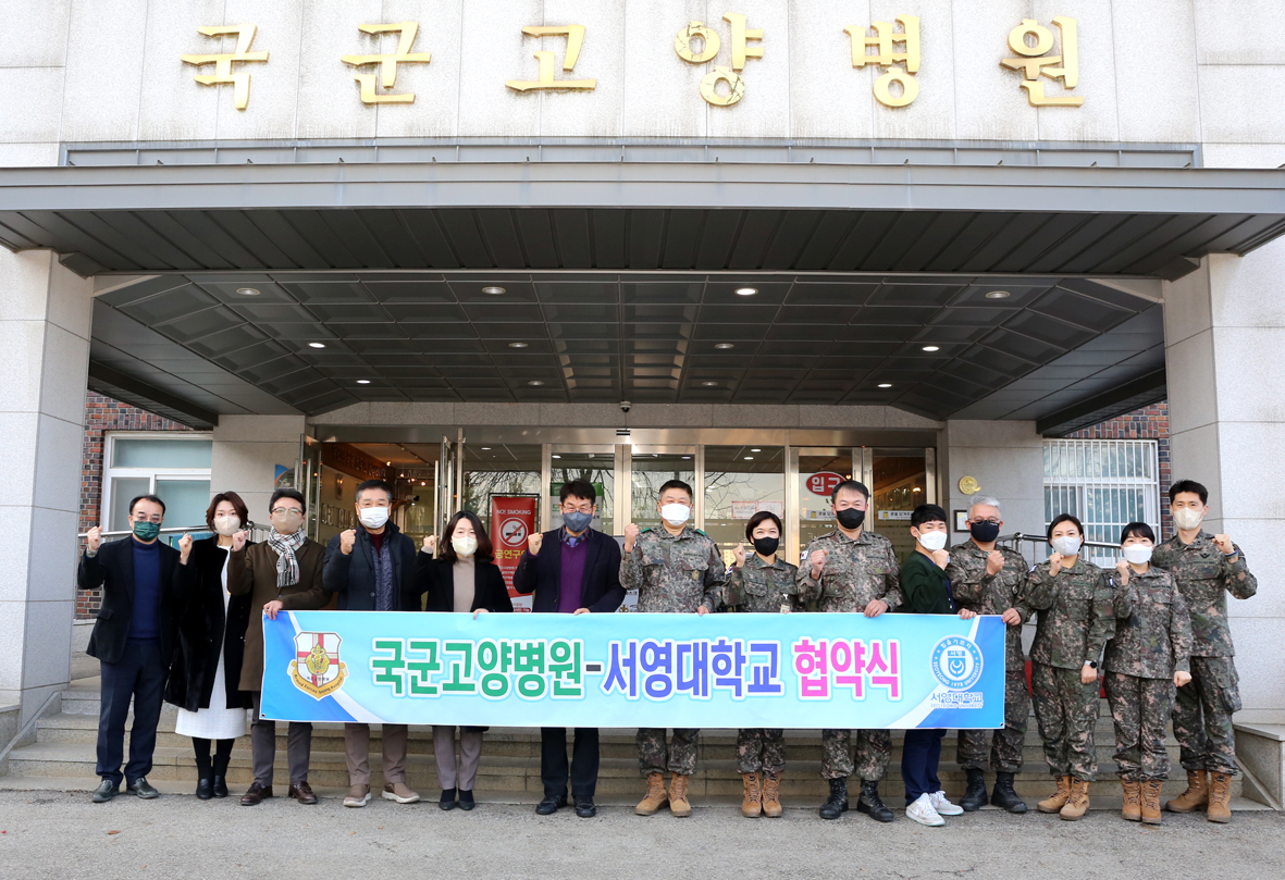 지난 12월 28일, 우리대학 (총장 김정수)은 국군고양병원 (병원장 홍기태)과 장병 및 국민보건향상과 연구 및 교육의 상호 협력, 선진 군 의료체계 공동발전을 위해 상호 업무협약을 체결하였다. 협약식은 국군고양병원 회의실에서 진행 되었으며, 김순곤 서영대학교 부총장, 장동민 입학홍보처장, 장철인 학생취업처장, 이명선 치위생과 학과장, 이지웅 임상병리과 학과장, 홍보경 보건의료행정과 학과장, 서권홍 홍보기획팀장 등 서영대학교 관계자와 홍기태 병원장, 이인섭 인행과장, 군의관 등 국군고양병원 관계자 등 20여 명이 참석하였다.