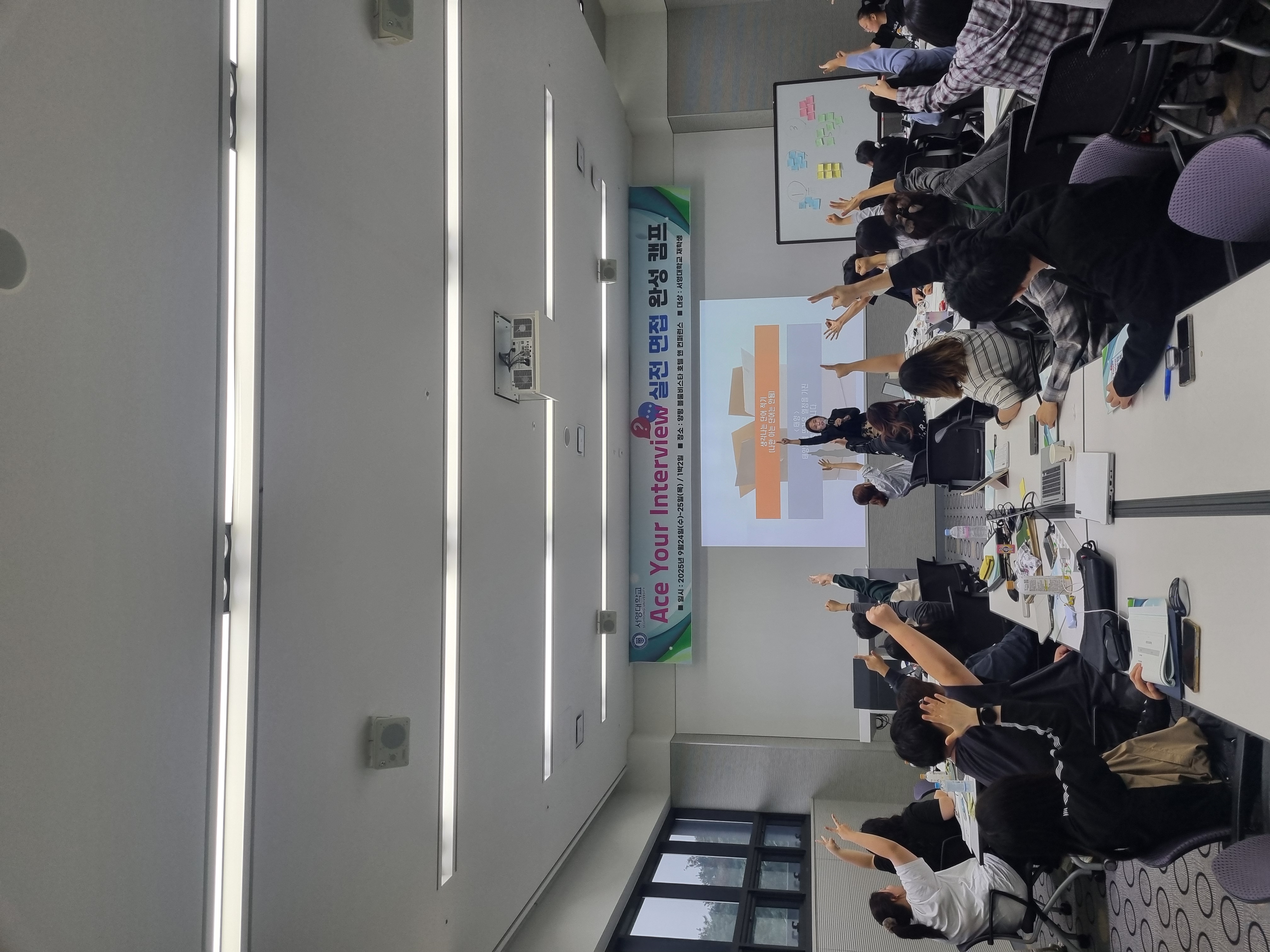 ○ 이번 캠프는 9월 16일(월) ‘자기소개서 작성 특강’ 사전교육을 시작으로 진행되었다. 이어 ▲ACE Briefing:2025 면접 트렌드 인사이트 ▲ACE Decode: 질문의 본질을 꿰뚫다 ▲ACE Script: 1분 자기소개 완성하기 ▲ ACE Pitch: 나를 말하는 기술 실전나 ▲ACE Etiquette: 태도와 매너의 합격 기준 ▲ACE Task: 협동과 몰입의 시간 ▲ACE Battle: 실전 모의면접 ▲ACE Reflection: 모의면접 피드백&자기소개마무리 활동으로 진행되었다.